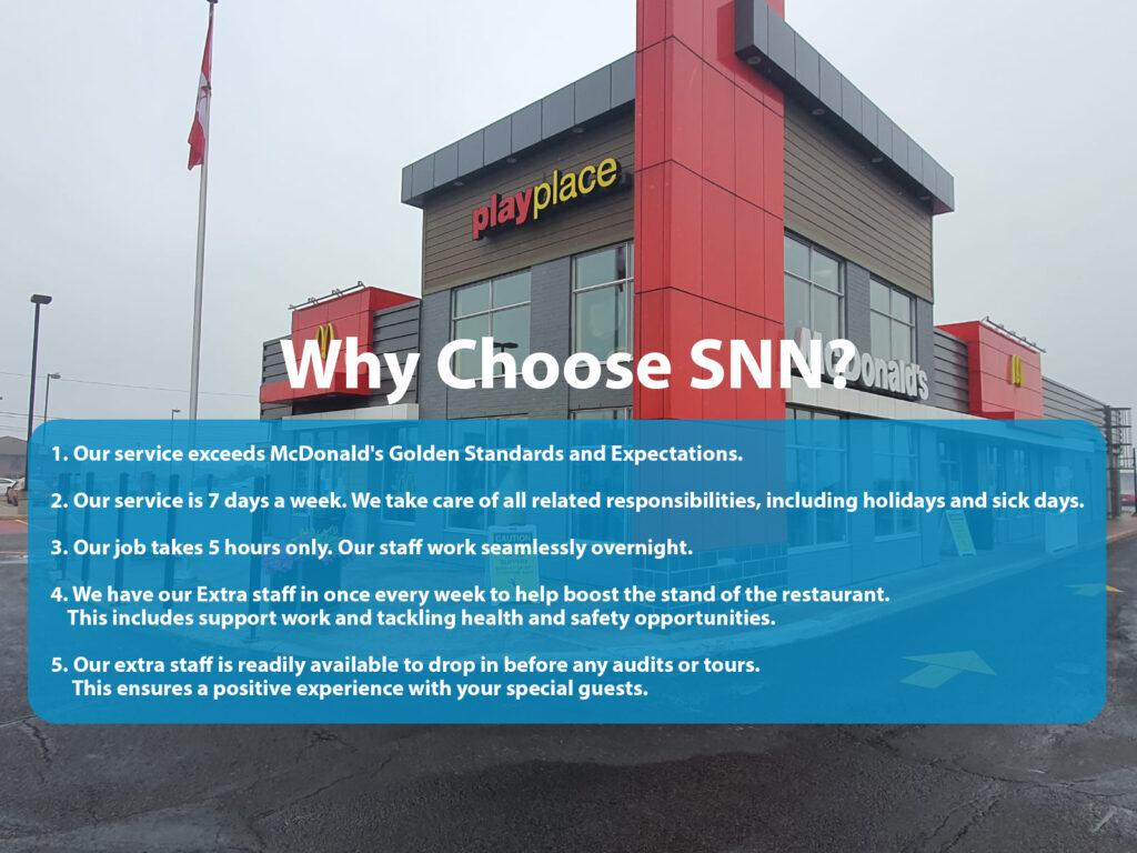 SNN MAINTENANCE LTD. is a janitorial company based in Toronto, providing services across Ontario. We offer a variety of cleaning services, designed specifically for the McDonald’s Stores. Our services provide exemplary results, ensuring our clients expectations have been exceeded.